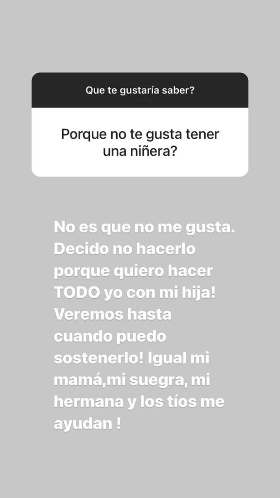 “Tengo el mejor marido del universo y un equipo (mi mamá, suegros, Giani y tíos que bancan mi decisión de no tener niñera)”, arrancó Dalma, al compartir el planteo de uno de los consumidores de la red social, que quiero saber cómo hacía para organizar sus tiempos.