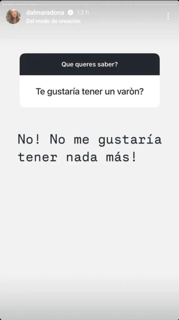 “No, no me gustaría tener más nada”, respondió tajante y sin vueltas la hija del ex futbolista argentino fallecido el 25 de noviembre del 2020. Asimismo, la compañera de streaming del conductor de LAM optó por responderle a otro usuario de instagram siguiendo la misma línea temática.