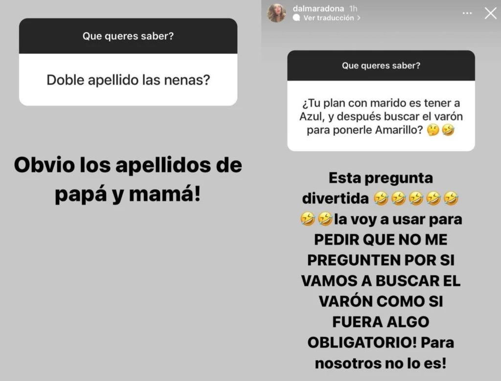 “¿Las nenas tienen doble apellido?”, indagó un usuario. A lo que la hija mayor de Diego Maradona reconoció: “Obvio, los dos apellidos, de papá y mamá”. Del mismo modo, la panelista de radio Metro comentó que ninguna de sus dos hijas tiene segundo nombre, anulando así cualquier posibilidad de que sea Yoro.