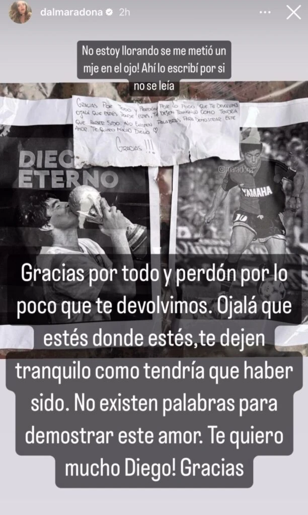 “6 meses de delay te lo agradezco. Gracias por este mimo al alma. Gracias por amarlo tanto. No estoy llorando, se me metió un mensaje en el ojo”, escribió Dalma. Luego, la heredera mayor del astro del fútbol redactó lo que decía la carta por si no la llegaban a leer.