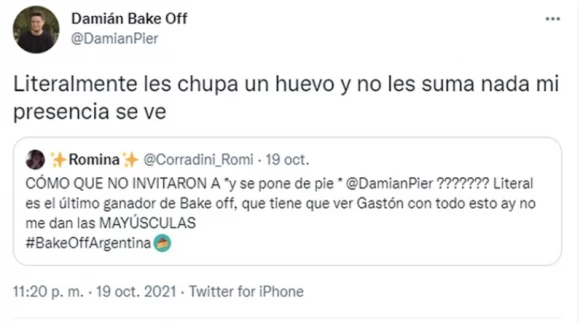 "¿Cómo que no invitaron a Damián? Literal es el último ganador de Bake Off, no sé qué tiene que ver Gastón con todo esto”, “todo bien con Georgina, pero mi hijo está indignado porque no invitaron a @DamianPier. Mamá, ¿por qué no invitaron a Dami que sabe de pastelería y podía ayudarlos de verdad?”, escribieron los seguidores en la red del pajarito.