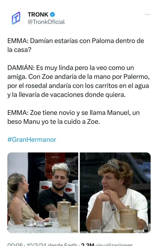 Por eso, Emma le remarcó “Zoe tiene novio y se llama Manuel. Un beso Manu. Yo te la cuido a Zoe”. Lo que Emma no sabe es el conflicto interno que hay afuera entre la mamá de la participante y quien sería su yerno el que, incluso, anunció que llevará a la justicia por ensuciar su imagen con falsas declaraciones.