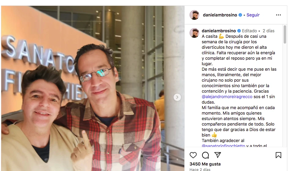 Por otra parte, el panelista de Intrusos, Pablo Layús, especificó el problema que necesitó de un ingreso al quirófano y publicó: “Dani Ambrosino ya se encuentra en su hogar después de casi una semana internado, recibió el alta médica y regresó a su casa. El periodista fue operado por un cuadro de divertículos”.