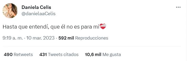 Pero ahora, un llamativo mensaje de Dani en Twitter dio a entender que la historia con Thiago habría llegado a su fin. Con un emoji de corazón herido, Pestañela escribió una frase tan corta y sintética como letal: "Hasta que entendí, que él no es para mi" .