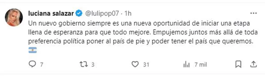 Luciana Salazar, quien estuvo muy relacionada por su anterior relación a Martín Redrado, escribió un mensaje de unión y buscado dejar atrás tantas diferencias: “Un nuevo gobierno siempre es una nueva oportunidad de iniciar una etapa llena de esperanza para que todo mejore. Empujemos juntos más allá de toda preferencia política, poner al país de pie y poder tener el país que queremos”.