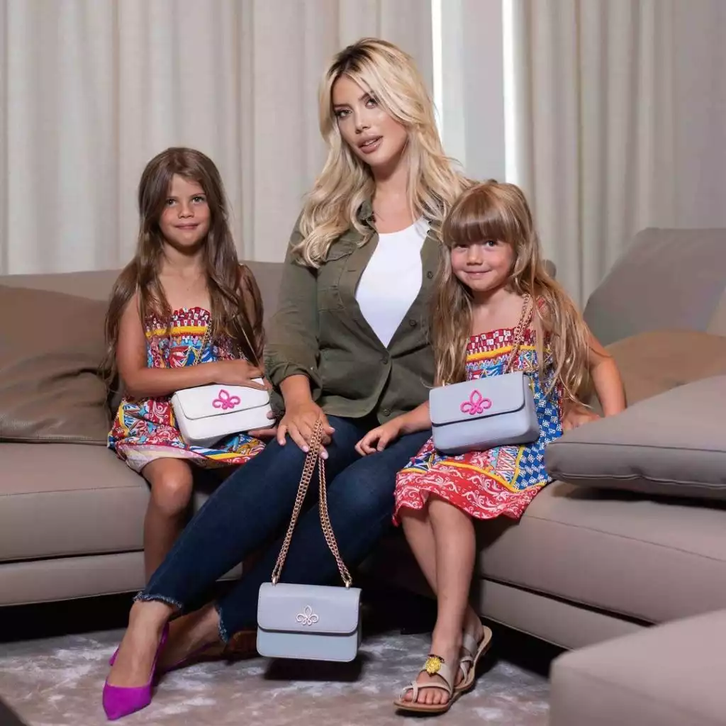 Pero, en esta ocasión, las tres lucieron sentadas en un enorme sillón mientras se reían entre ellas y un fotógrafo profesional retrataba sus sonrisas. Además, tanto las pequeñas como Wanda sostenían y posaban con diversos modelos de carteras de la reconocida firma House of Florence, las cuales rondan los 30 mil pesos argentinos cada una (125 euros en cotización blue).