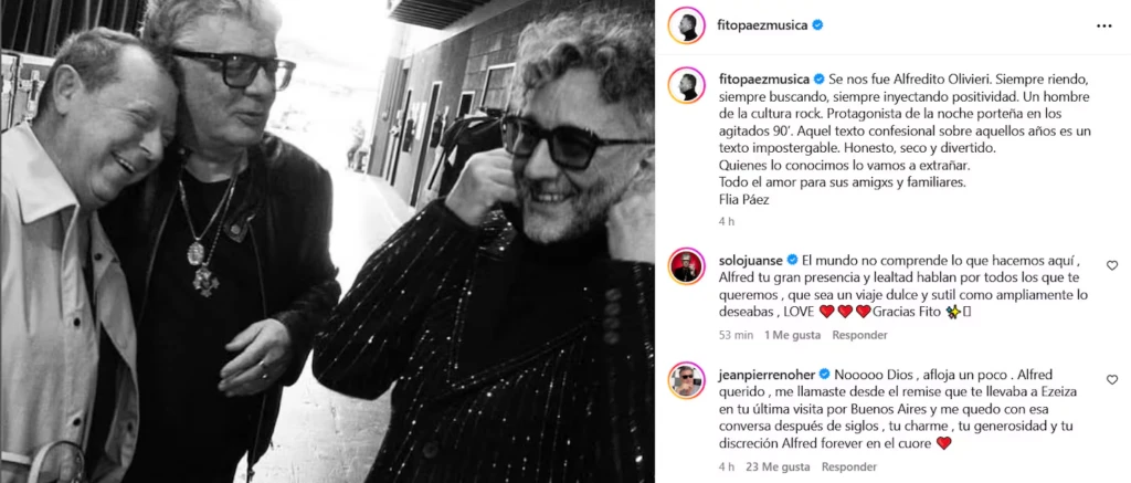 Por su parte, Juanse, líder de los Ratones Paranoicos, también dejó un mensaje especial en el post de Fito: “El mundo no comprende lo que hacemos aquí, Alfred tu gran presencia y lealtad hablan por todos los que te queremos, que sea un viaje dulce y sutil como ampliamente lo deseabas. LOVE”.