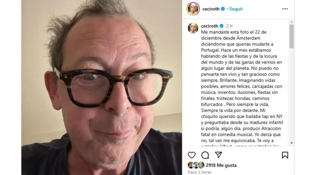 Cecilia Roth, quien compartió muchísimo tiempo al lado de Alfred, le escribió todo un posteo entero en su memoria. Recordando viejas épocas, Oliveri vivirá por siempre en el corazón de la actriz. “Te voy a extrañar Alfred, como se extrañan los jazmines en invierno", cerró la ex de Páez.