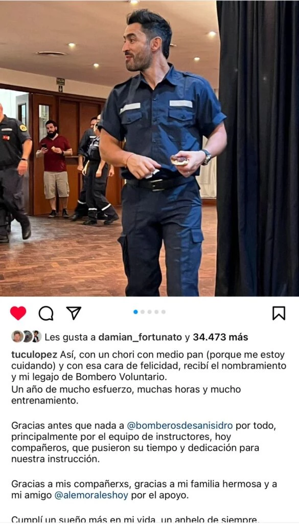 Finalmente, días atrás el Tucu anunció que había logrado ese objetivo mediante un carrete de fotos que posteó en su perfil acompañado de un texto en el que manifestó: “Así, con un chori con medio pan (porque me estoy cuidando) y con esa cara de felicidad, recibí el nombramiento y mi legajo de Bombero Voluntario”.