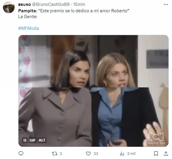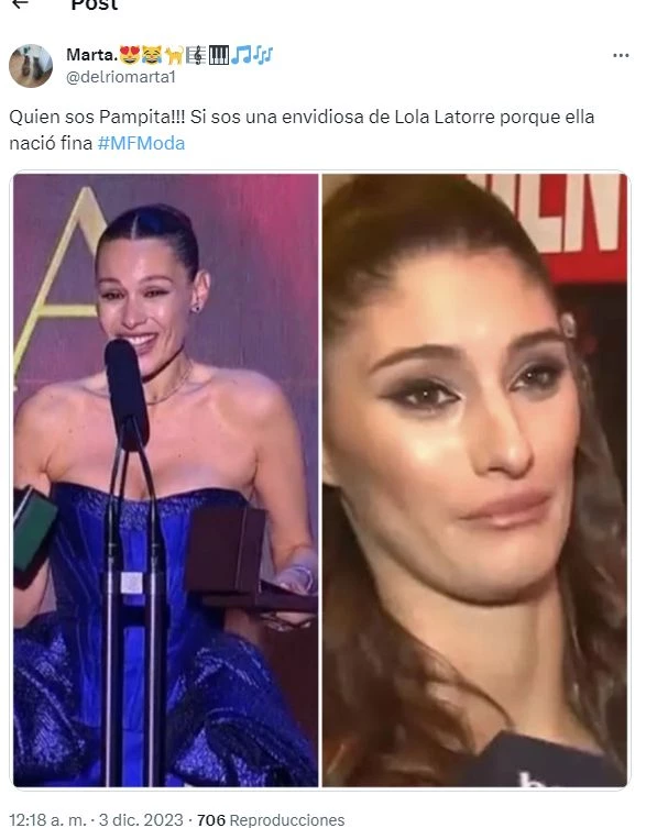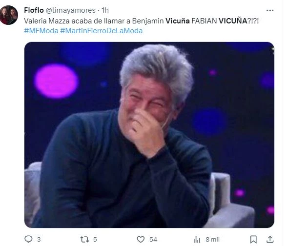 Ocurre que la prestigiosa modelo se equivocó en el nombre de Benjamín Vicuña y lo llamó "Fabián" de manera errónea. Aunque varios famosos fueron el foco de atención en los chistes, muchos de ellos se direccionaron a Pampita, quien recibió varios comentarios por la decisión de ganar el premio a la trayectoria en lugar de otros modelos como Iván de Pineda.