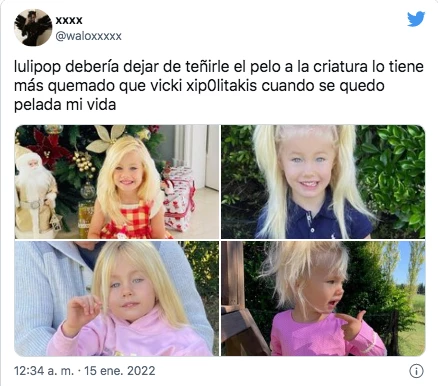 Una mujer decidió aglutinar varias fotos de la niña y exclamar una acusación muy fuerte, sin mayores sustentos que una presunción. “Lulipop debería dejar de teñir el pelo a la criatura, lo tiene más quemado que Vicky Xipolitakis cuando se quedó pelada”, posteó.