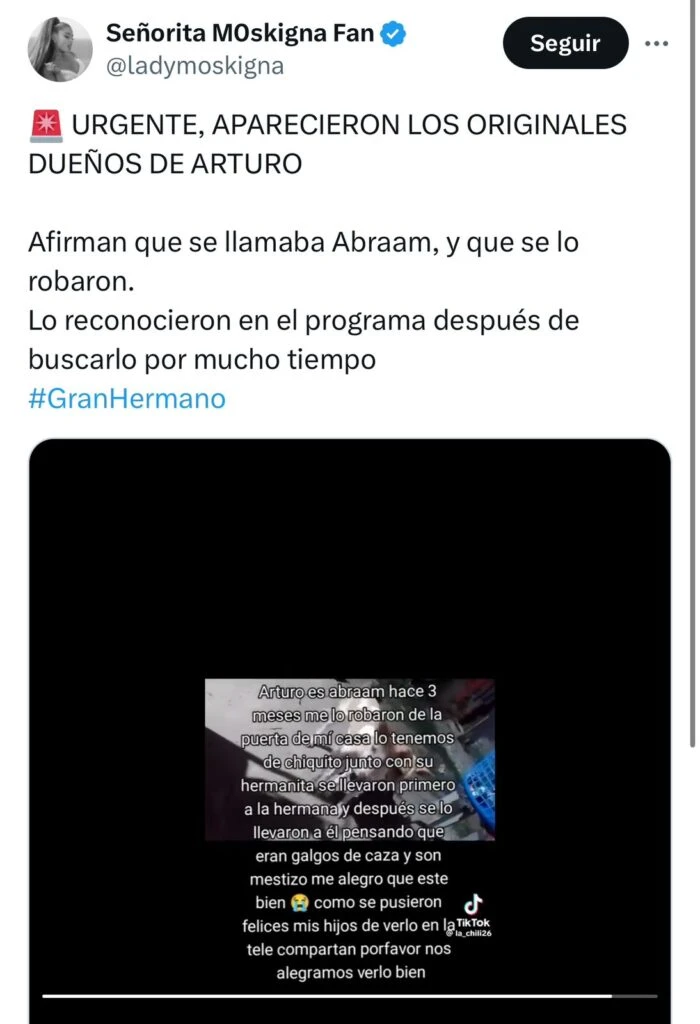 En las últimas horas el reel que circuló en Tiktok mostraba a quienes serían sus verdaderos dueños cuidando de él desde que era muy pequeño y citaron: “Arturo es Abraham, hace tres meses me lo robaron de la puerta de mi casa. Lo tenemos de chiquito junto a su hermanita, primero se la llevaron a ella pensando que son galgos de caza y son mestizos".