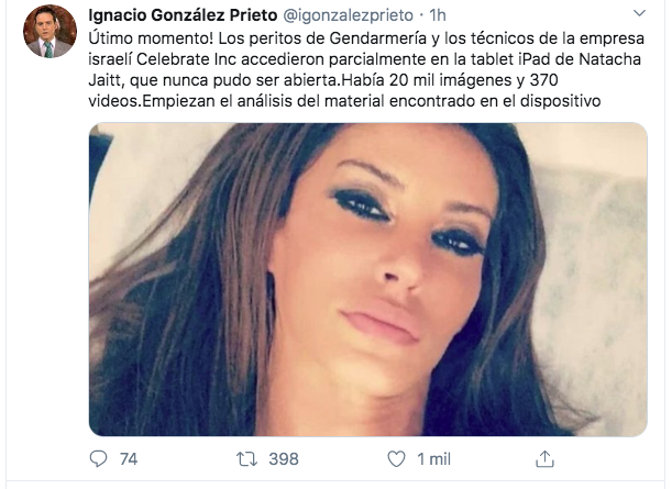 También, quien contó más detalles del contenido fue Ignacio Gonzalez Prieto, periodista de TN: “Los peritos de Gendarmería y los técnicos de la empresa israelí Celebrate Inc accedieron parcialmente en la tablet iPad de Natacha Jaitt, que nunca pudo ser abierta. Había 20 mil imágenes y 370 videos .Empiezan el análisis del material encontrado en el dispositivo”