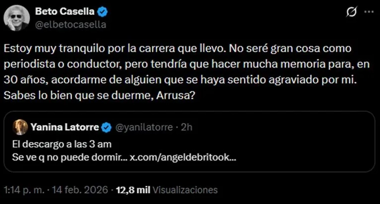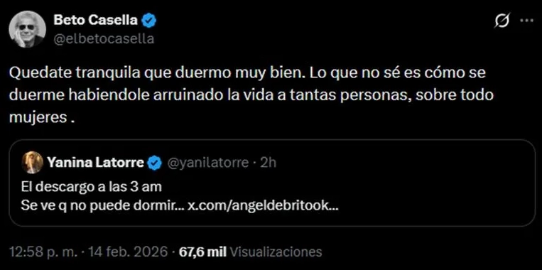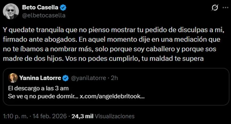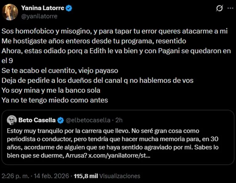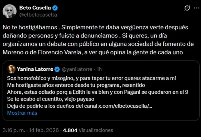 La guerra que desde hace muchos años tienen Yanina Latorre y Beto Casella volvió a explotar con fuerza. Lo que había empezado como un intento de bajarle el tono a una polémica, terminó convirtiéndose en un nuevo capítulo de este enfrentamiento ya eterno. Y ahora, con un cruce que trascendió la pantalla chica y se mudó -parcialmente- a las redes sociales.