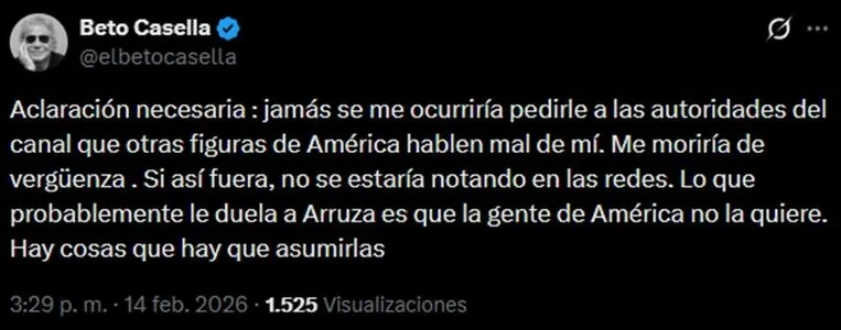 Pero Casella volvió a responder: “No te hostigábamos. Simplemente te daba vergüenza verte después dañando personas… Si querés, un día organizamos un debate con público…”. Y luego aclaró: “Jamás se me ocurriría pedirle a las autoridades del canal que otras figuras de América TV hablen mal de mí… Me moriría de vergüenza”.