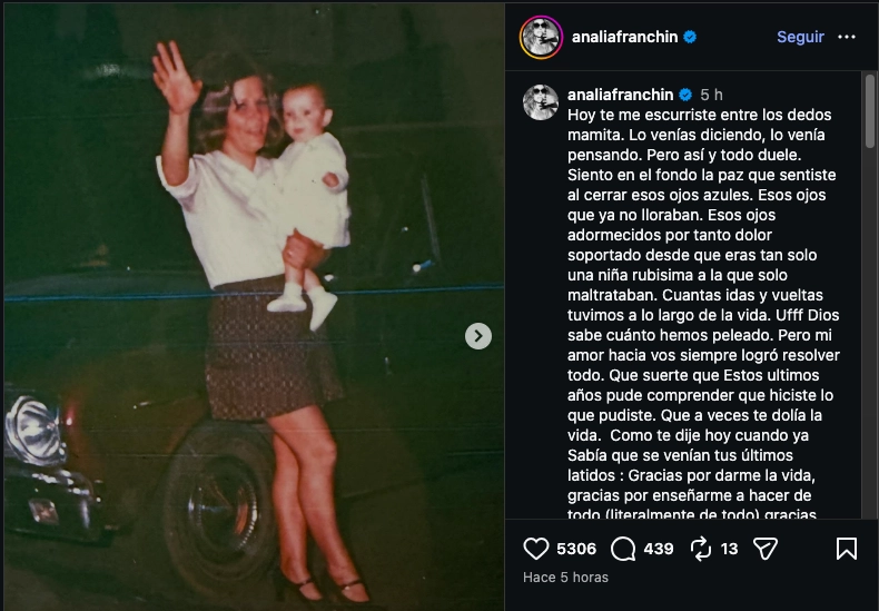 EL MENSAJE DE ANALÍA FRANCHÍN TRAS LA MUERTE DE AMALIA, SU MAMÁ