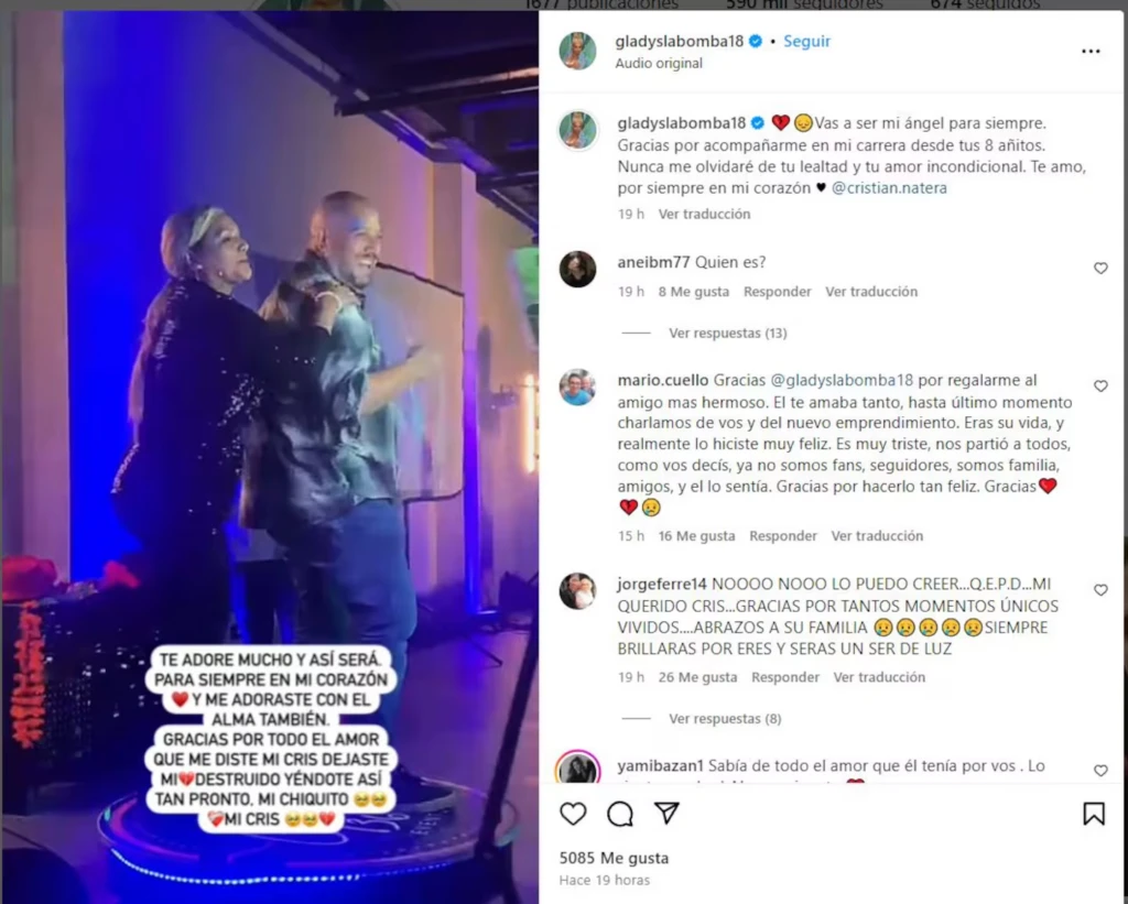 Pero en estas últimas horas, Gladys atraviesa uno de sus peores momentos luego de confirmar la muerte de una persona muy especial. Mediante sus redes sociales, La Bomba despidió a Cristian Natera, uno de sus amigos más cercanos.