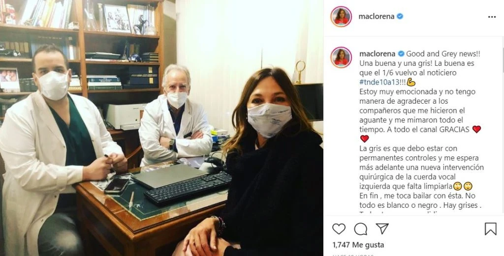 Y siguió: “La gris es que debo estar con permanentes controles y me espera más adelante una nueva intervención quirúrgica de la cuerda vocal izquierda que falta limpiarla. En fin, me toca bailar con ésta. No todo es blanco o negro. Hay grises”.
