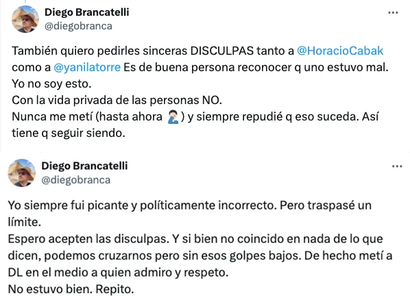 "También quiero pedirles sinceras DISCULPAS tanto a Horacio Cabak como a Yanina Latorre. Es de buena persona reconocer que uno estuvo mal. Yo no soy esto. Con la vida privada de las personas NO. Nunca me metí (hasta ahora) y siempre repudié que eso suceda. Así tiene que seguir siendo", agregó después.