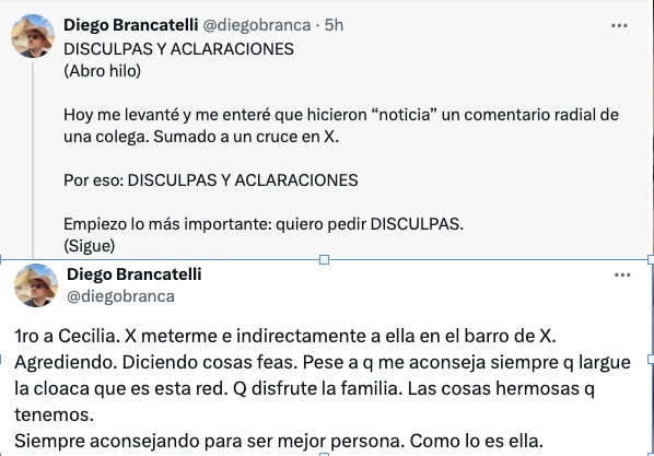 "Disculpas y aclaraciones" arrancó el periodista su "hilo" de toma de conciencia. "Hoy me levanté y me enteré que hicieron “noticia” un comentario radial de una colega. Sumado a un cruce en X. Por eso: DISCULPAS Y ACLARACIONES Empiezo lo más importante: quiero pedir DISCULPAS. (Sigue)". Así lo escribió, con muchas mayúsculas para que no queden dudas de su intención.