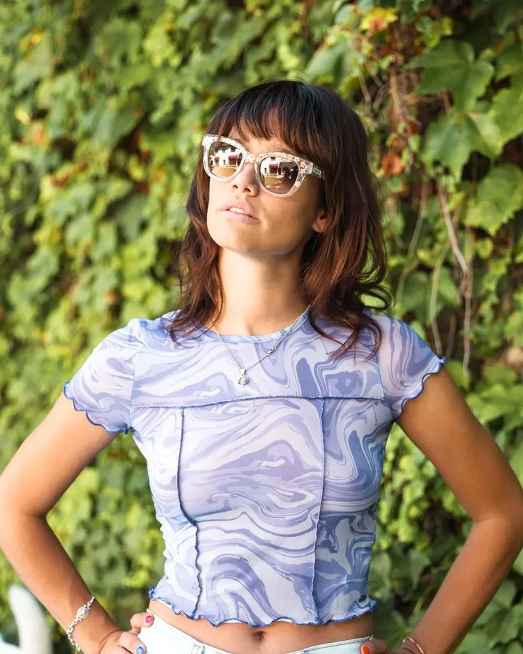 En las mismas, se la veía luciendo un top trasparente en tonos lila y blanco con unas gafas de sol. En las dos primeras se la puede ver tapándose sus pechos con desopilantes caras, mientras que en la última luce su delantera totalmente tranquila mirando hacia un costado.