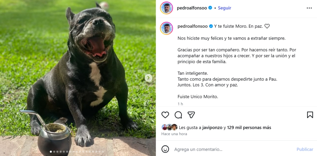 Pedro le agradeció a su perrito por “ser la unión y el principio de esta familia”. “Tan inteligente. Tanto como para dejarnos despedirte junto a Pau. Juntos. Los tres. Con amor y paz. Fuiste único, Morito”, cerró.