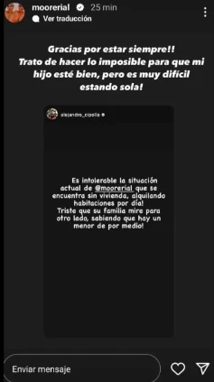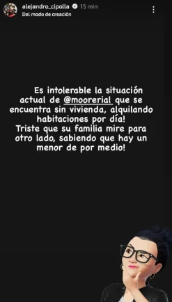 Cipolla apuntó a Jorge y a la hermana de More, Rocío, por no brindar apoyo en este momento crítico: "Triste que su familia mire para otro lado, sabiendo que hay un menor de por medio", expresó. La propia More Rial confirmó la difícil situación en su cuenta de Instagram, expresando su lucha para que su hijo esté bien, a pesar de sentirse sola.