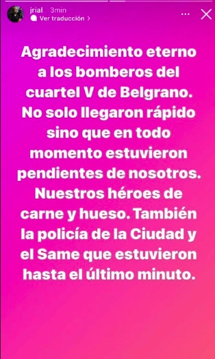 Luego llegó el turno de los reconocimientos. "Agradecimiento eterno a los bomberos del cuartel V de Belgrano. No sólo llegaron rápido sino que en todo momento estuvieron pendientes de nosotros". No conforme con esa frase, señaló que los muchachos y las chicas se transformaron en "nuestros héroes de carne y hueso". Además, señaló a "la policía de la Ciudad y al Same que estuvieron hasta último minuto".