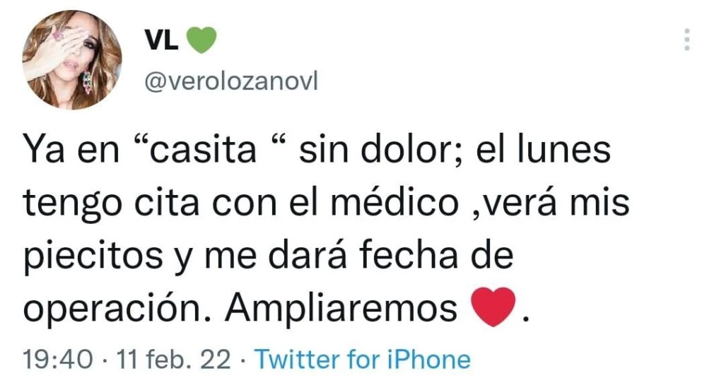 Lejos de seguir sembrando dudas y preocupación por su salud, Vero decidió contarle a sus seguidores cómo va todo: "Ya en casita sin dolor; el lunes tengo cita con el médico ,verá mis piecitos y me dará fecha de operación. Ampliaremos". Solo queda esperar a que todo salga bien para la conductora.