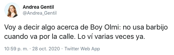 Quien lo denunció a través de Twitter fue Andrea Gentil, editora de las secciones Ciencia, Salud y Tecnología en la revista Noticias, que asombrada por la actitud del actor decidió escracharlo en la red del pajarito: “Voy a decir algo acerca de Boy Olmi: no usa barbijo cuando va por la calle. Lo ví varias veces ya”.