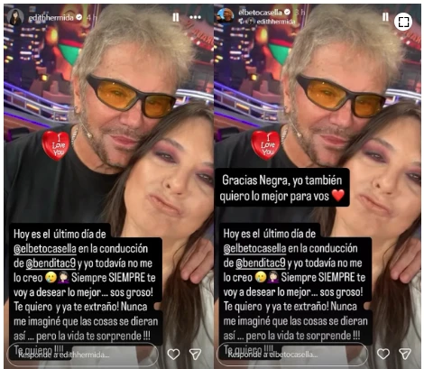 Edith armó un posteo muy emotivo y con dos fotos personales, en las que luce muy cómplice con Beto, le escribió unas dedicatorias sumamente amorosas. "Hoy es el último día de Beto Casella en la conducción de Bendita yo todavía no me lo creo. Siempre siempre te voy a desear lo mejor... Sos groso! Te quiero y ya te extraño!", posteó.