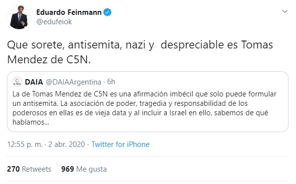 Eduardo Feinmann compartió ese texto de repudio en Twitter y junto a él comentó: "Que sorete, antisemita, nazi y despreciable es Tomás Méndez de C5N”. De este modo, el conductor volvió a quedar en el centro de una discusión compleja que genera polémica.
