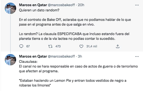 "¿Quieren un dato random?" le preguntó Marcos a sus seguidores. No necesitó respuesta para brindarlo, porque en el mismo posteo explicó que "En el contrato de Bake Off, aclaraba que no podíamos hablar de lo que pase en el programa antes de que salga al aire", arrancó.