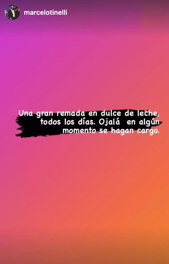 El conductor de ShowMatch escribió en su Instagram: “Una gran remada en dulce de leche, todos los días. Ojalá en algún momento se hagan cargo”. Todo indicaría que se refiere a una bronca por el bajo rating que le deja de piso Telenoche y que consideraría como una de las causas para las exiguas mediciones de La Academia.