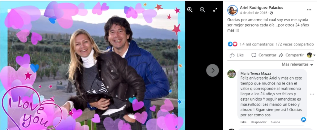Esta variación en la cotidianidad de Rodríguez Palacios acentuó el foco en su vida personal, así se maximizó en las últimas horas el interés por conocer aspectos de su privacidad. Entre los que se destaca su esposa Valeria, esa mujer que eligió para caminar por el altar hace 30 años.