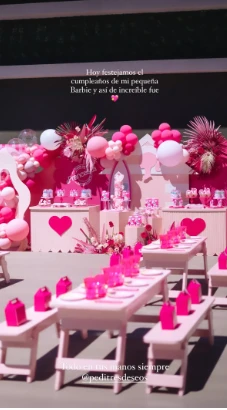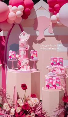 El candy bar se destacó con una llamativa torta de tres pisos en tono rosa, decorada con la figura de Barbie, palmeras, pelotas de playa y tablas de surf, todo coronado con la casa de la muñeca. La celebración reflejó un ambiente de ensueño acorde con la temática elegida.