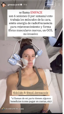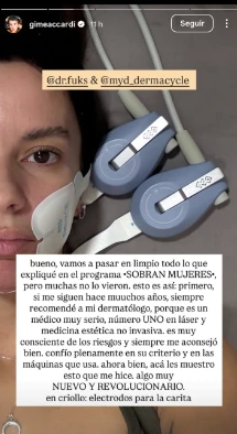 A través de sus stories de Instagram, Accardi abrió las puertas un momento muy privado, ya que cargó fotos del instante preciso en que le aplican un procedimiento novedoso. Y ella misma lo explicó: “Hace diez años que voy a mi dermatólogo, que es un médico muy serio”.