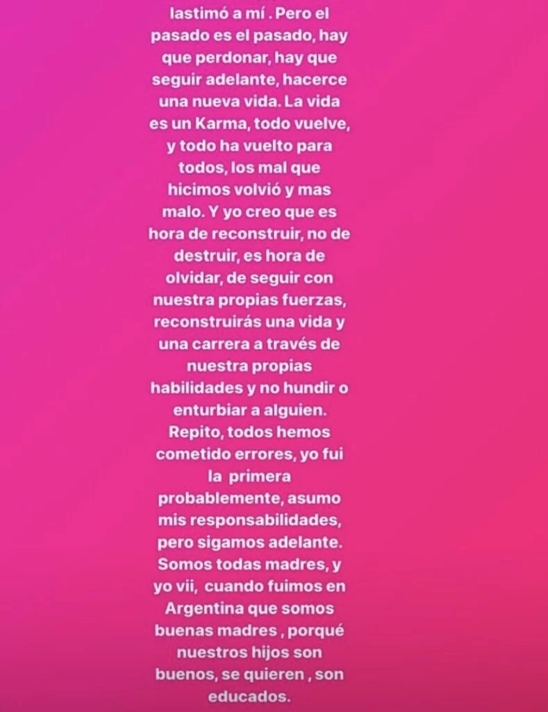 "Los males que hicimos volvieron y peor. Yo creo que es hora de reconstruir, no de destruir. Es hora de olvidar, de seguir con nuestra propia fuerza. Reconstruirás una una vida y una carrera a través de nuestras propias habilidades y no hundiendo o enturbiando a alguien", expresó.