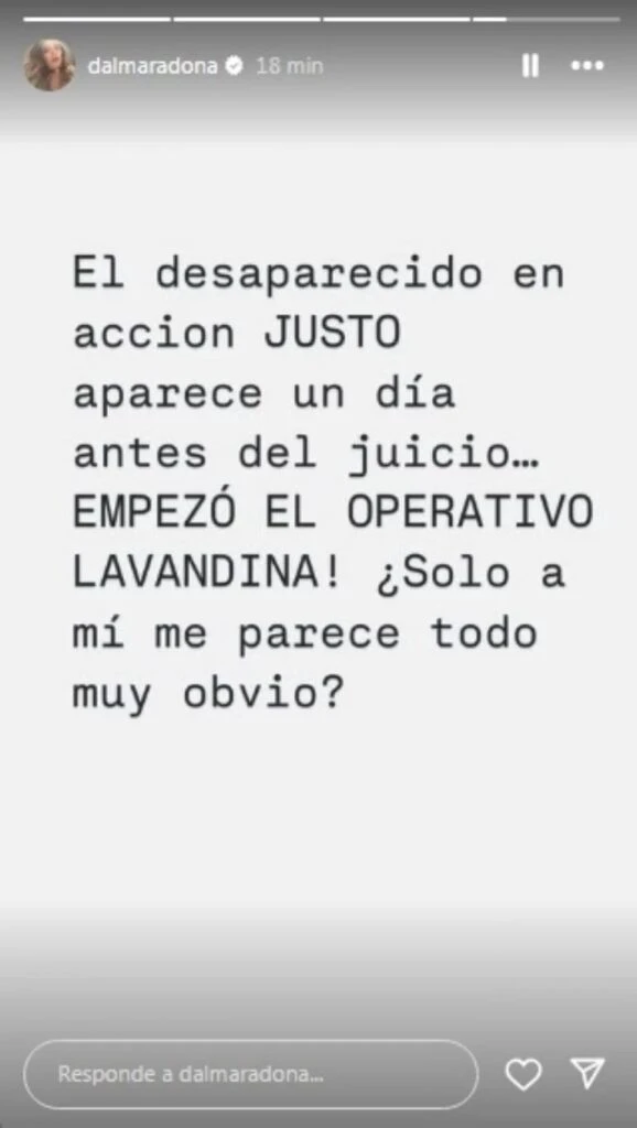 “El desaparecido en acción JUSTO aparece un día antes del juicio... ¡Empezó el operativo lavandina! ¿Sólo a mí me parece que todo es muy obvio?”, expresó la hija de Diego a través de una historia que compartió en su cuenta de Instagram. Por supuesto que esto trajo a colación opiniones divididas.