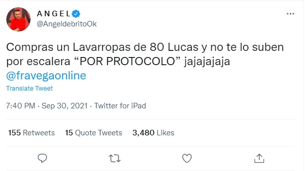 En la red del pajarito el jurado de La Academia compartió: "Compras un lavarropas de 80 lucas y no te lo suben por la escalera por "protocolo"", acto seguido arrobó a Fravega on line, la reconocida empresa de venta de electrodomésticos para quien iba dirigido el mensaje.