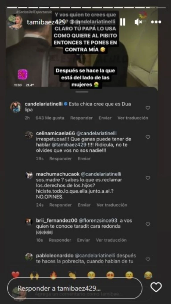 Indignada, Tamara escribió: ”¿Y vos quién te creés que sos? Claro, tu papá lo usa como quiere al pibito... Entonces, te ponés en contra mía. Después se hace la que está del lado de las mujeres...". Sin embargo, Cande Tinelli no volvió a responderle a la influencer.
