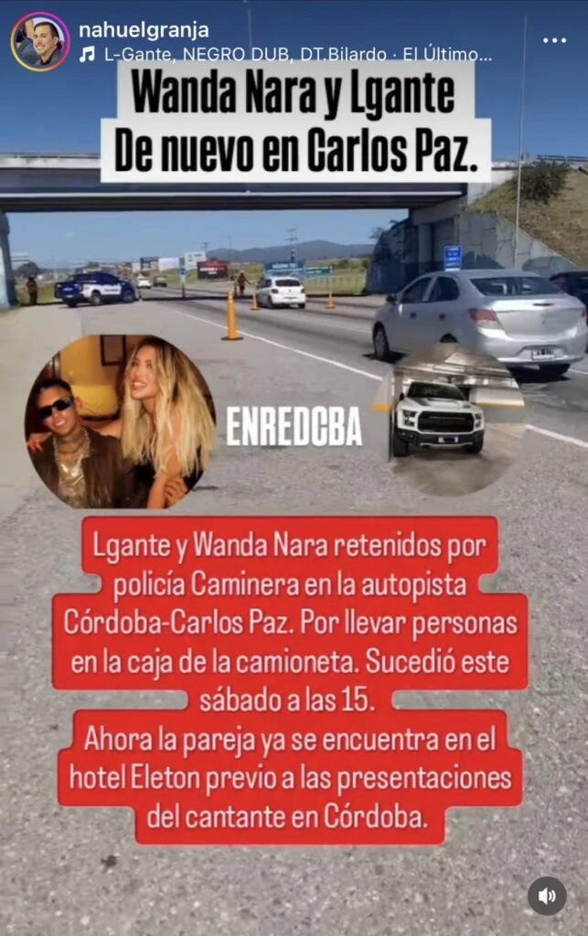 La información que había trascendido era que la empresaria y L-Gante fueron demorados por la policía caminera de Córdoba en la autopista Justiniano Posse, que conecta Córdoba Capital con Villa Carlos Paz. Si bien la situación pudo haber tenido mayor repercusión, la pareja pudo continuar su viaje tras efectuarse la multa correspondiente. No obstante, Wanda negó que esto haya sucedido realmente.