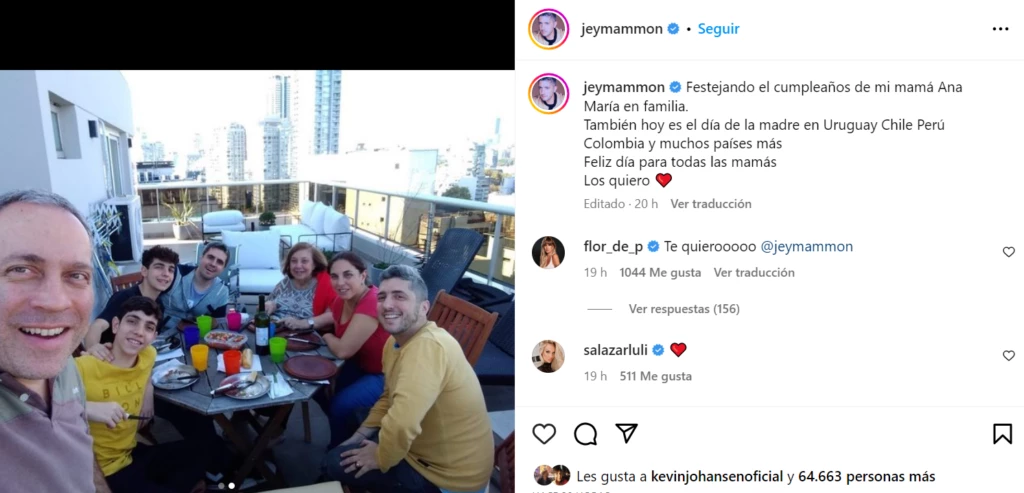 “Festejando el cumpleaños de mi mamá Ana María en familia.También hoy es el día de la madre en Uruguay Chile Perú Colombia y muchos países más. Feliz día para todas las mamás. Los quiero”, expresó Mammon en su posteo que logró casi 70 mil likes en menos de 24 horas.