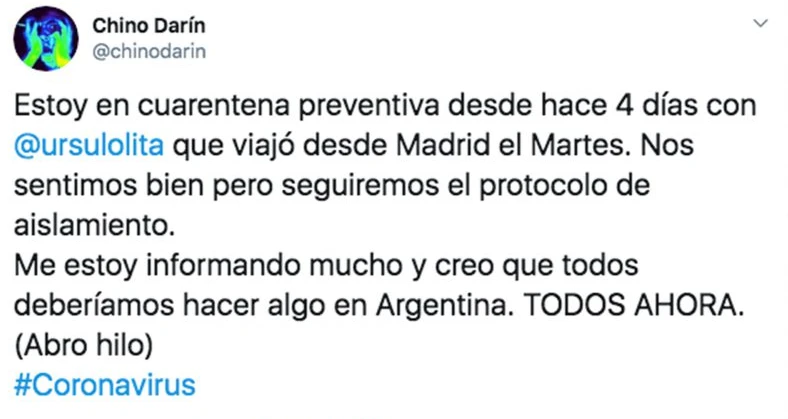 Y siguió: “Los números oficiales NO son los casos reales. No representan ni un 5% de los afectados reales que andan en la calle. El largo período de incubación hace que los detectemos siempre tarde. Todos podríamos estar infectados ahora mismo sin saberlo. Amigos, vecinos, etc. Cuídense”.
