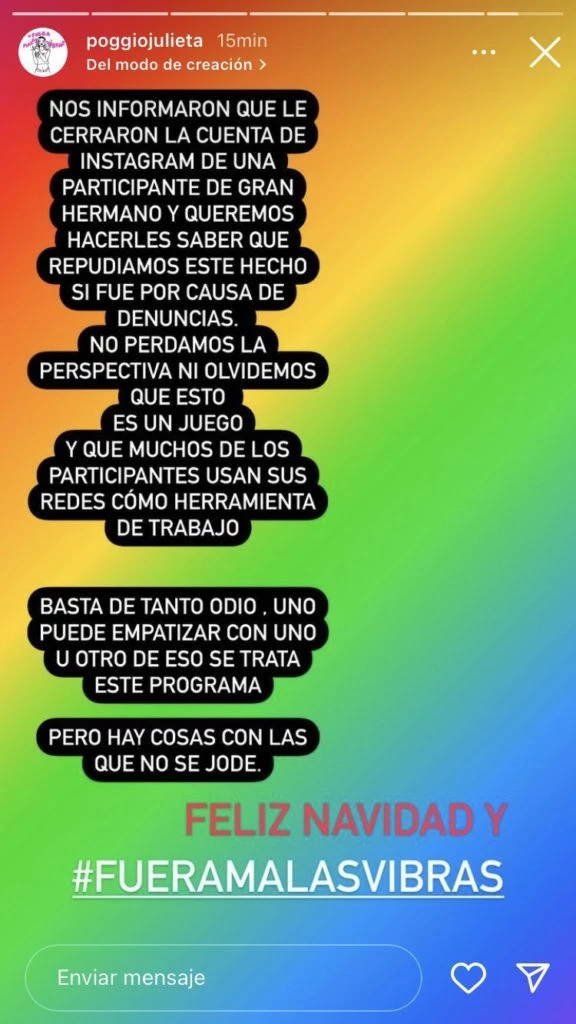 Ante esta situación, la familia de Julieta posteó: “Repudiamos este hecho si fue por una causa de denuncias. No perdamos la perspectiva ni olvidemos que esto es un juego y muchos de los participantes usan sus redes como herramienta de trabajo. Basta de tanto odio, uno puede empatizar con uno u otro, pero hay cosas con las que no se jode".