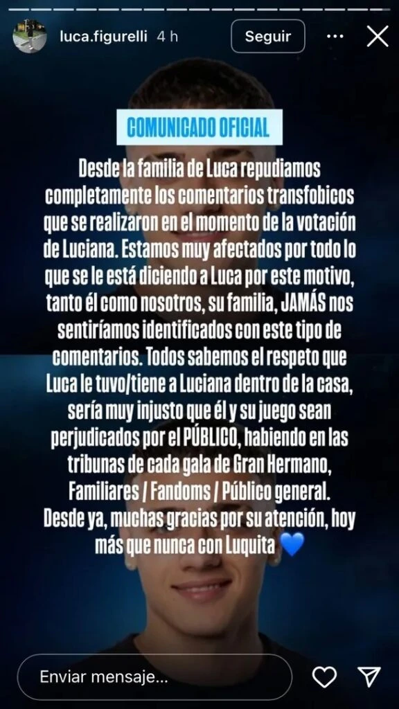 “Desde la familia de Luca repudiamos completamente los comentarios transfóbicos que se realizaron en el momento de la votación de Luciana. Estamos muy afectados por todo lo que se le está diciendo a Luca por este motivo, tanto él como nosotros, su familia, JAMÁS nos sentiríamos identificados con este tipo de comentarios”, comienza explicando el comunicado que publicó el círculo íntimo de Luca.