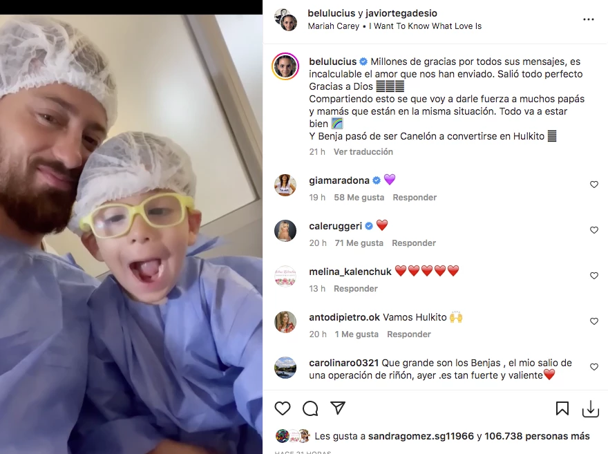 "Millones de gracias por todos sus mensajes, es incalculable el amor que nos han enviado. Salió todo perfecto gracias a Dios. Compartiendo esto sé que voy a darle fuerza a muchos papás y mamás que están en la misma situación. Todo va a estar bien. Y Benja pasó de ser Canelón a convertirse en Hulkito”, dijo Belu, quien reconoció padecer un mal desde chiquita.
