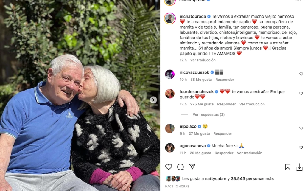 "Te vamos a estar sintiendo y recordando siempre como te va a extrañar mamita... 61 años de amor!! ¡¡Siempre juntos!! Gracias papito querido. Te amamos”, expresó Padra, a corazón abierto, en su cuenta oficial de Instagram, donde acumula miles de seguidores por su trabajo como productor de La Flia,la empresa de contenidos en la que trabaja para Marcelo Tinelli, hace varios años.