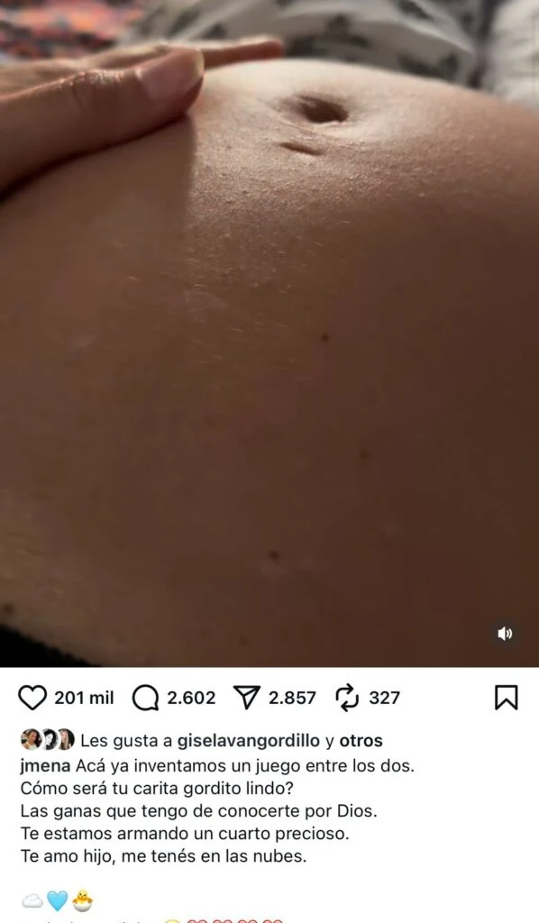“¿Cómo será tu carita gordito lindo? Las ganas que tengo de conocerte por Dios. Te estamos armando un cuarto precioso. Te amo hijo, me tenés en las nubes”, continuó Barón, quien inmediatamente cosechó miles de likes y comentarios celebrando el regalo de la vida que lleva en su vientre.