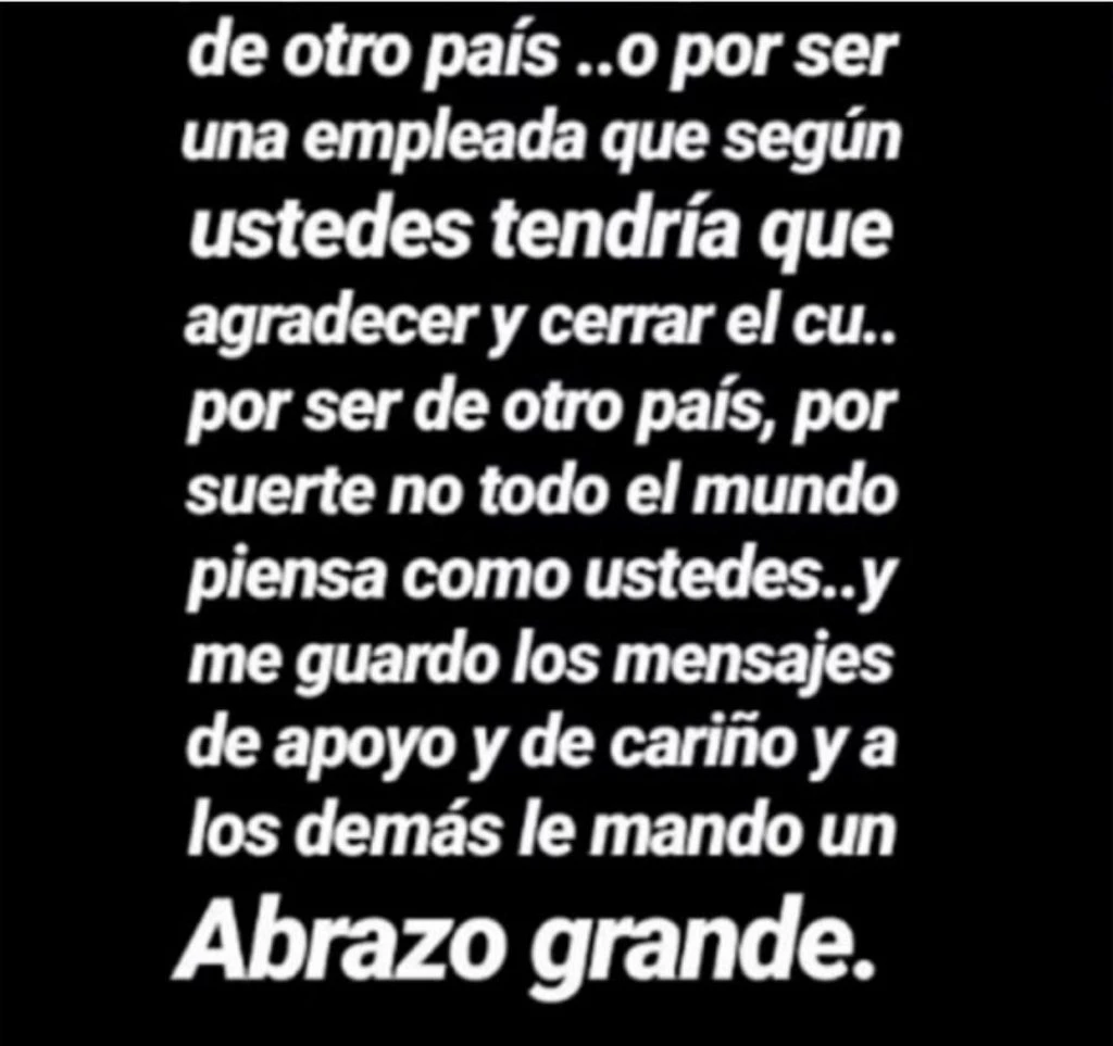 Hacia el final, apuntó a quienes la “descalificaron” por ser de otro país: “Es tan fácil juzgar a alguien por ser de otro país o por ser una empleada que según ustedes tendría que agradecer y cerrar el cu... por ser de otro país, por suerte no todo el mundo piensa como ustedes”, cerró visiblemente molesta.